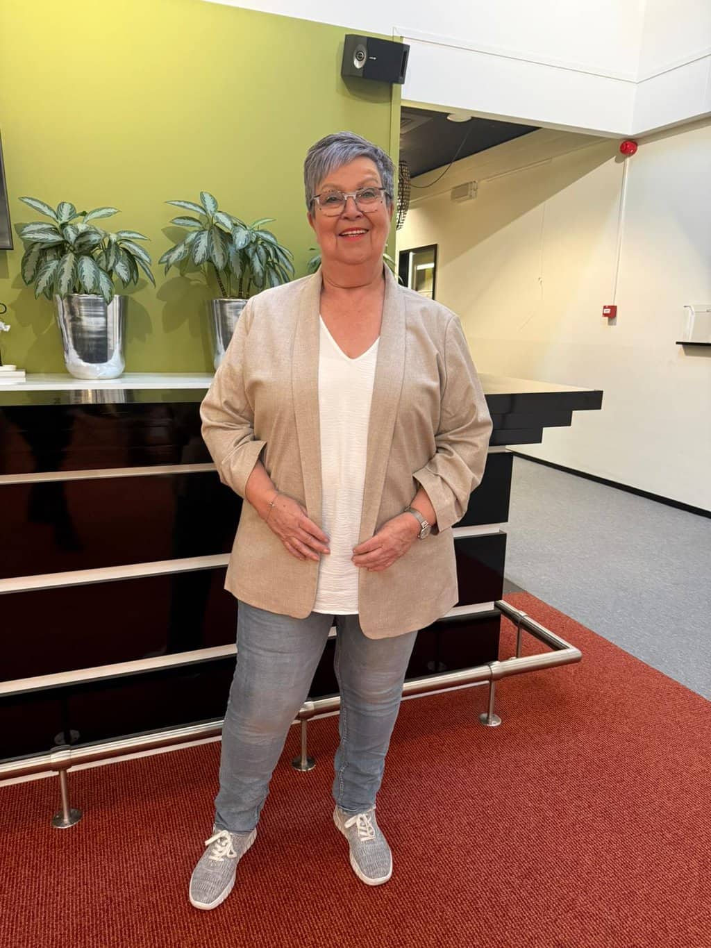 Marleen draagt een mooie beige blazer van Only Carmakoma , gecombineerd met een basic top van Only Carmakoma.