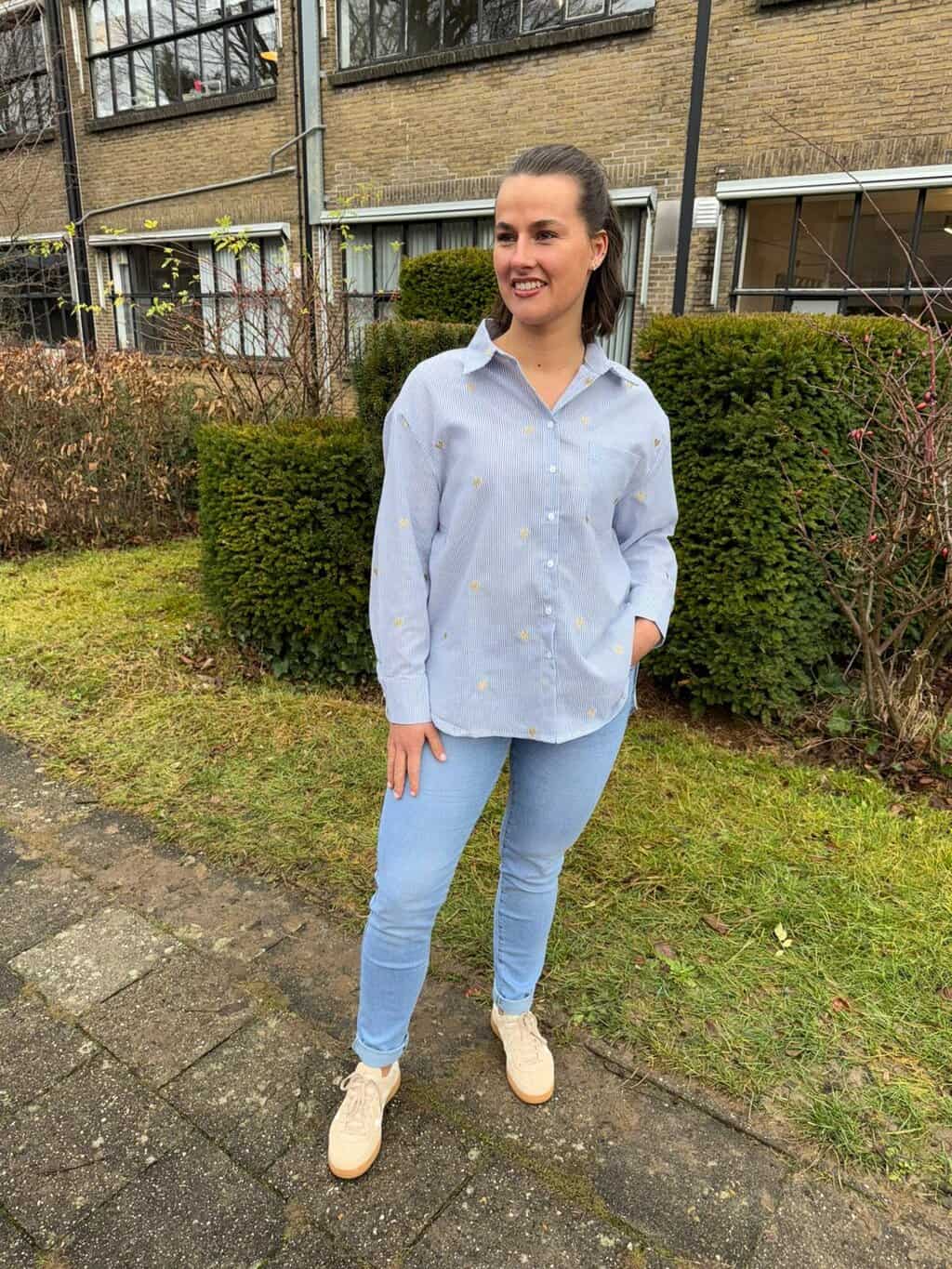 De jeans die ze draagt is van Norfy en draagt heerlijk door de stretch die erin zit.