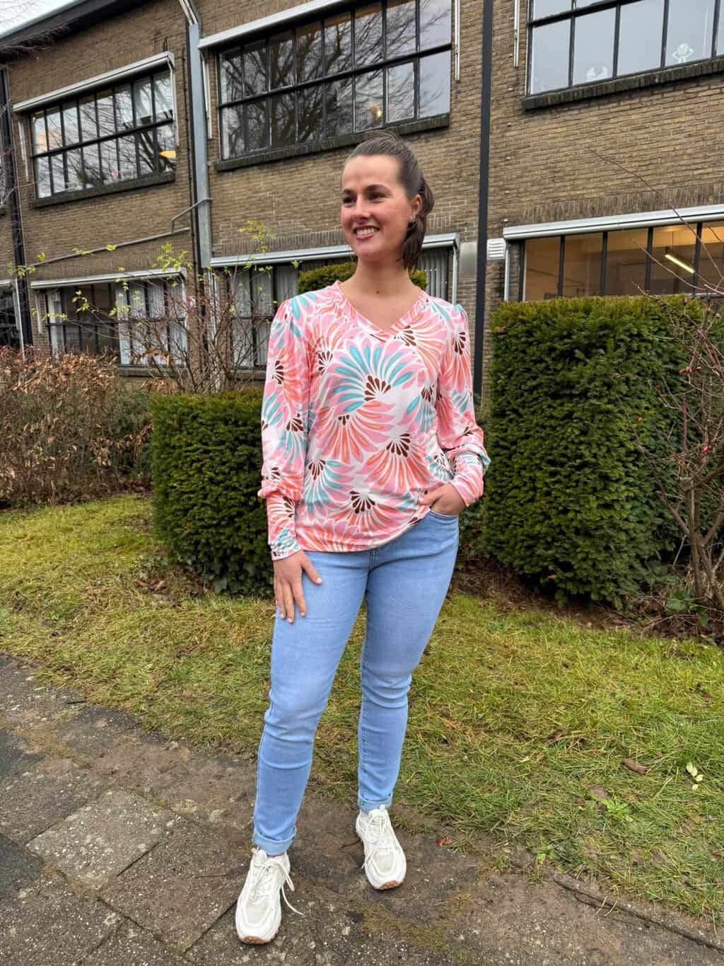 Ze heeft het gecombineerd met de favoriet van onze dames de travelbroek van Enjoy. Deze draagt comfortabel en is in meerdere kleuren verkrijgbaar.