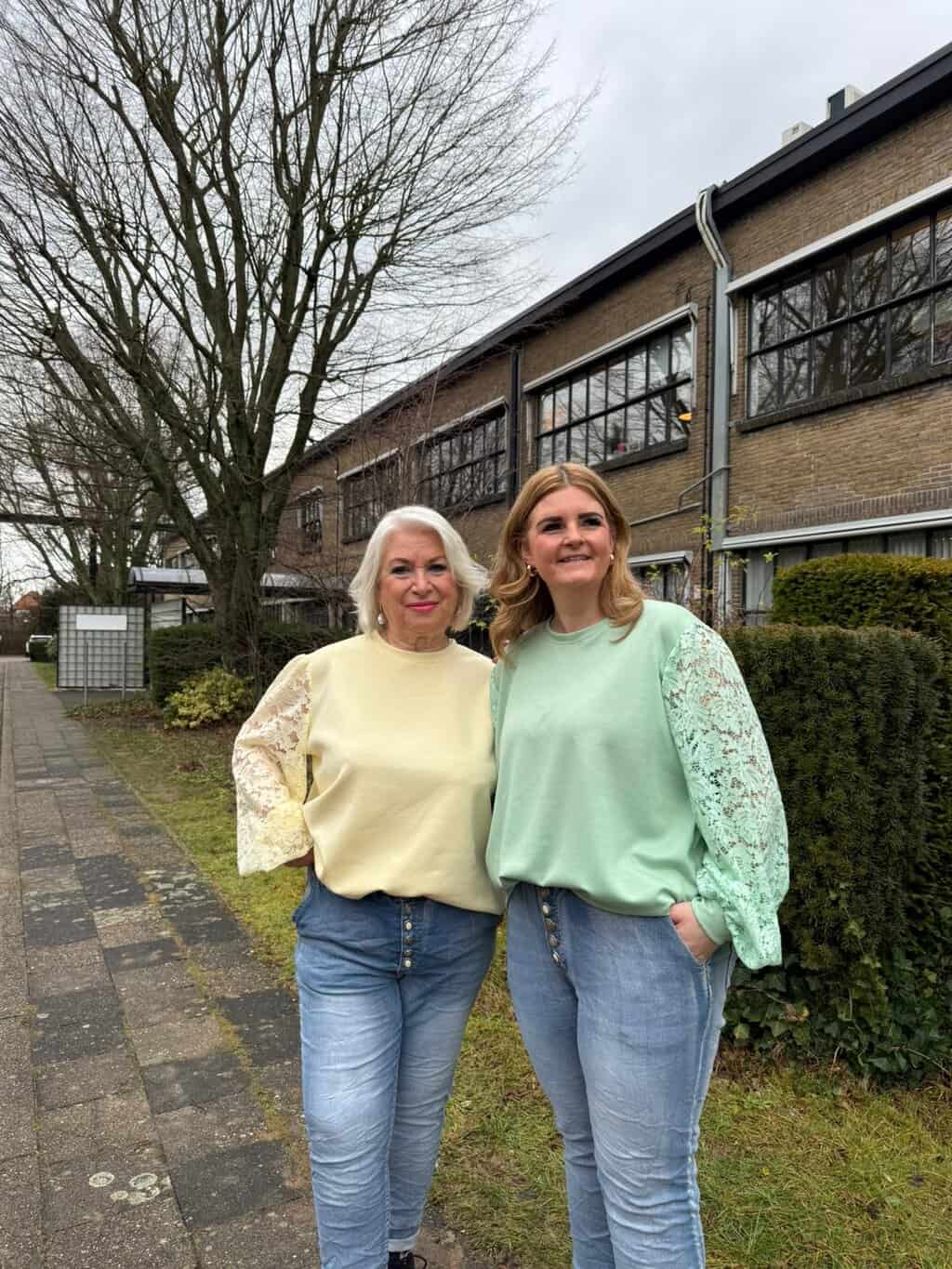 Dianne en Margriet dragen hier een trui van NF in de nieuwe voorjaarskleuren mintgroen en geel. De trui is te verkrijgen in veel meer andere mooie voorjaars kleuren en draagbaar van maat 44 tm 48. Ze dragen het in combinatie met onze NF comfy jeans. Dit is de favoriete jeans broek van onze dames en hebben we ieder seizoen in een andere wassing.