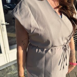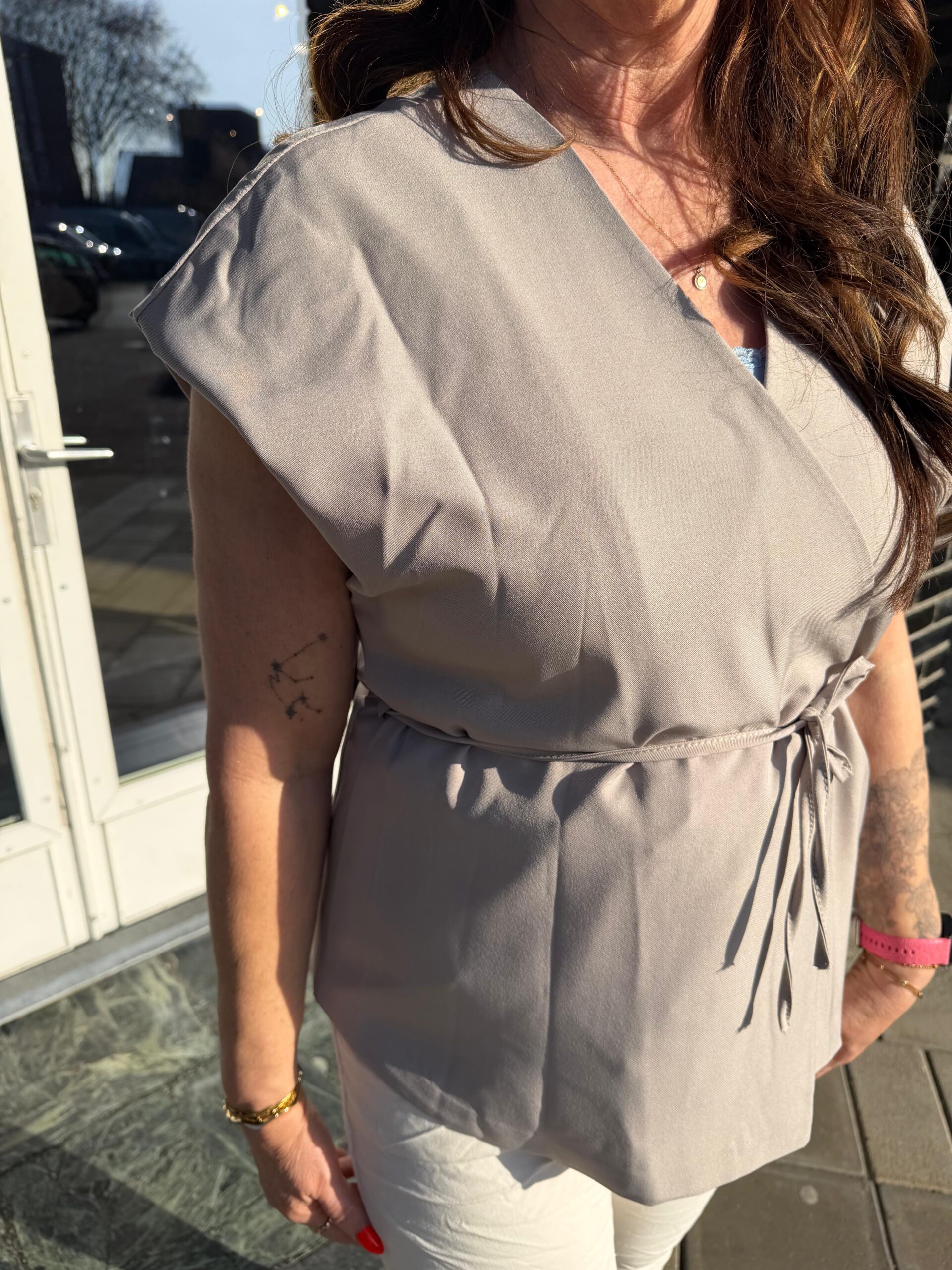 Dit beige gilet is een prachtige toevoeging aan je garderobe! De zachte, neutrale kleur zorgt voor een rustige en stijlvolle uitstraling, terwijl het strikdetail in de taille een mooi vrouwelijk silhouet creëert.