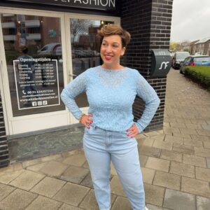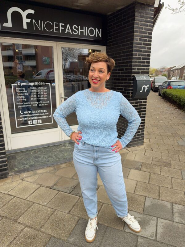 Licht blauwe kanten top met lange mouwen en ronde hals. Tijdloos, vrouwelijk en draagbaar van maat 36 t/m 42.