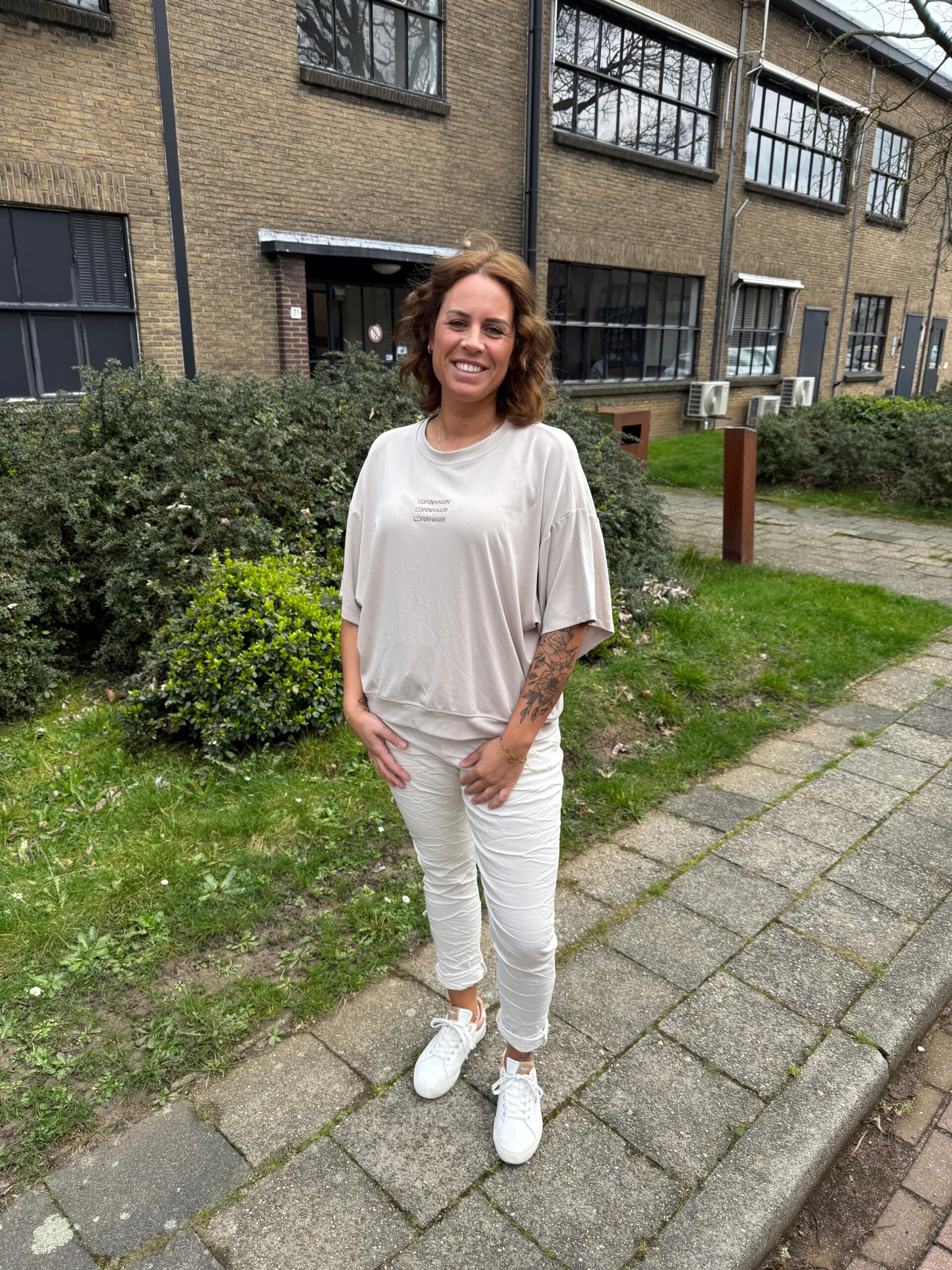 De aansluitende pasvorm zorgt voor een mooi en flatterend silhouet, terwijl de neutrale beige kleur eindeloos te combineren is. Of je nu kiest voor een casual look met sneakers of een iets nettere outfit met een blouse, deze broek past altijd.