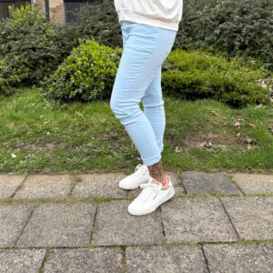 Deze trendy lichtblauwe stretchbroek is een perfecte mix van comfort en stijl. De zachte, soepele stof voelt heerlijk aan en dankzij de fijne stretch beweegt de broek moeiteloos met je mee.