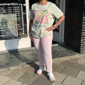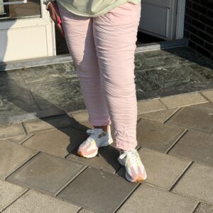 Comfortabele roze stretchbroek met elastische taille en strikdetail. De soepele pasvorm en zachte stof zorgen voor optimaal draagcomfort. Draagbaar van maat 44 t/m 50 en makkelijk te combineren