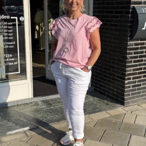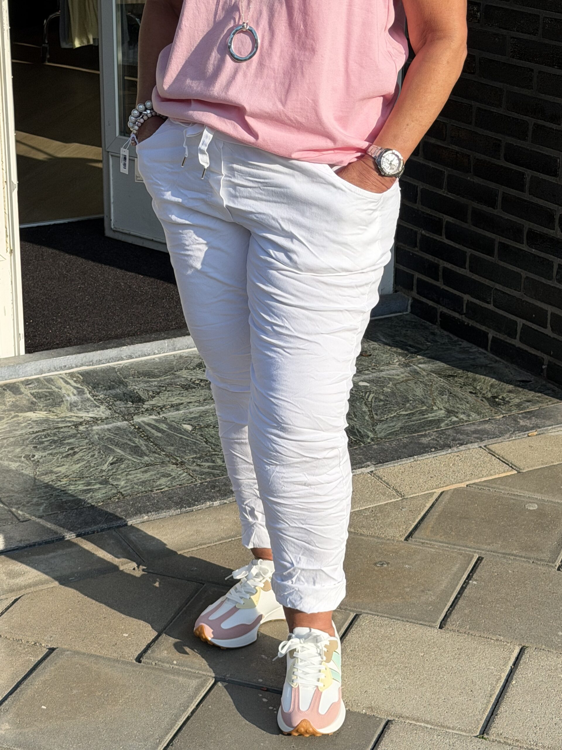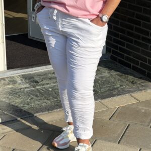 Comfortabele witte stretchbroek met elastische taille en strikdetail. De soepele pasvorm en zachte stof zorgen voor optimaal draagcomfort. Draagbaar van maat 44 t/m 50 en makkelijk te combineren