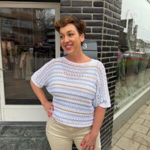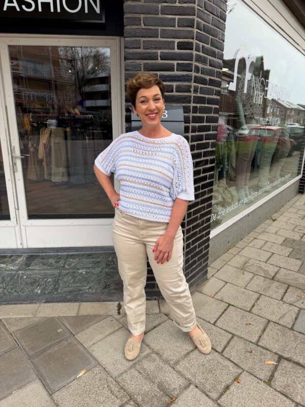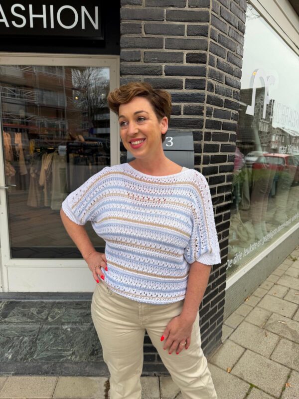 De Josje top in lichtblauw is een frisse en stijlvolle toevoeging aan je garderobe. Het opengewerkte breisel in combinatie met de zachte blauw- en goudtinten zorgt voor een elegante en zomerse uitstraling.