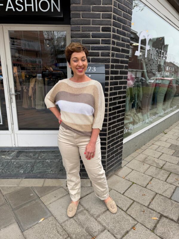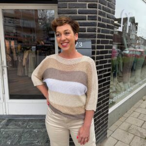 De Kelly top is een perfecte mix van comfort en elegantie. De mooie kleurblokken in neutrale tinten, gecombineerd met subtiele gouden accenten, geven deze top een rustige maar luxe uitstraling.