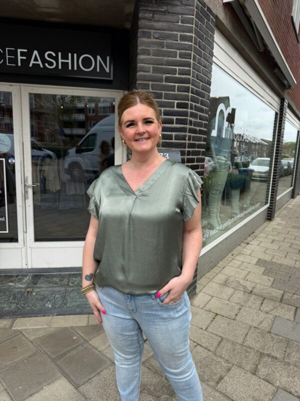 De Silky top straalt pure elegantie uit. De satijnen stof geeft een prachtige glans en voelt heerlijk zacht aan op de huid. De subtiele V-hals en speelse mouwtjes met ruches zorgen voor een vrouwelijke en verfijnde look.