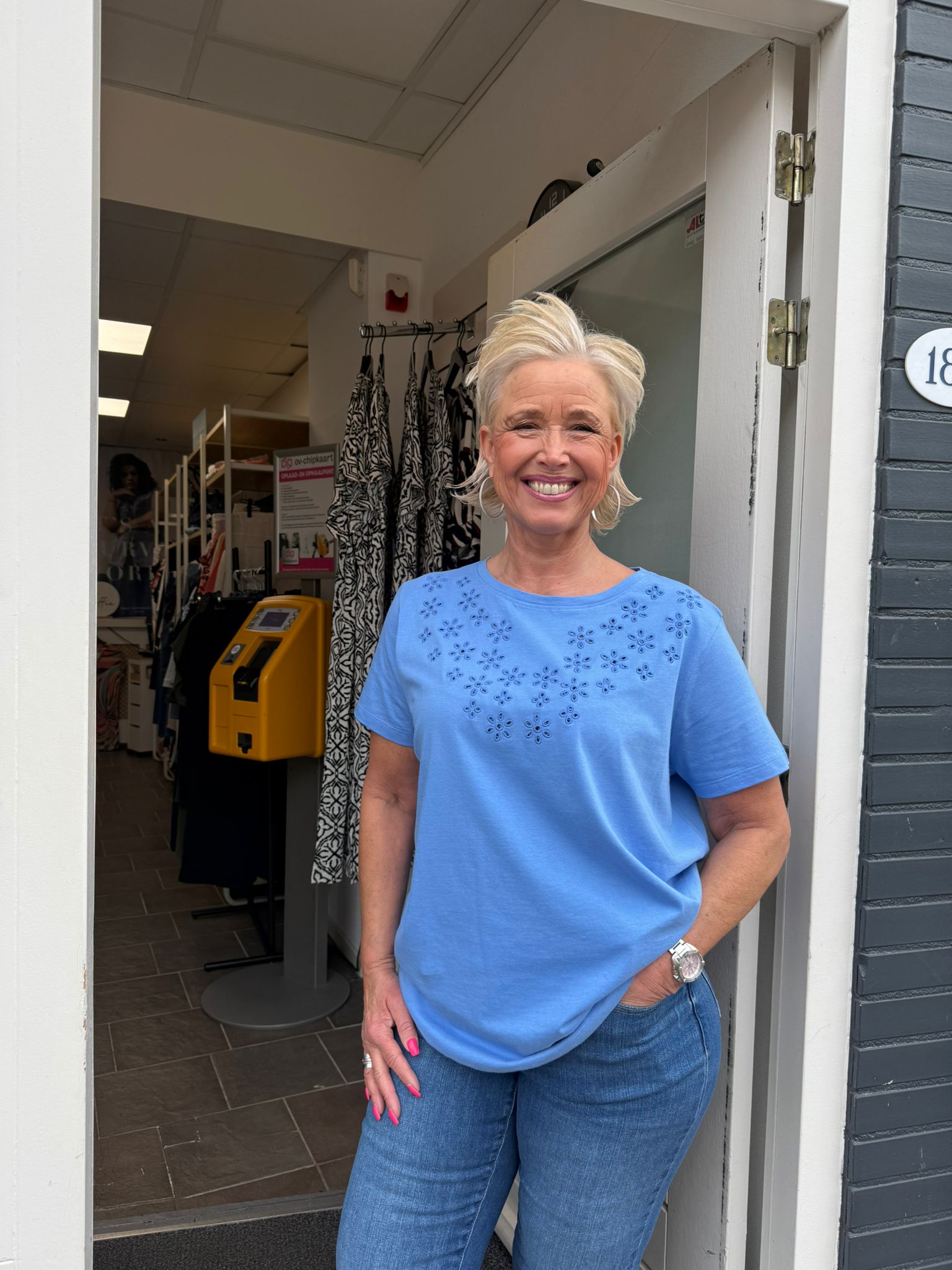 Een moderne, stijlvolle vrouw met jarenlange ervaring in de mode. Ze ademt stijl, ervaring en zelfvertrouwen. Met haar elegante uitstraling en moderne flair is ze het levende bewijs dat mode tijdloos is. Alles kan, als je het maar durft en probeert zegt ze altijd.