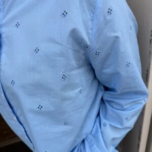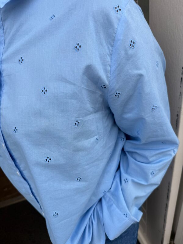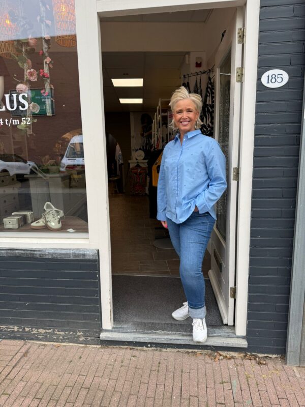 Lichtblauwe blouse met subtiel borduursel en fijne pasvorm.