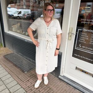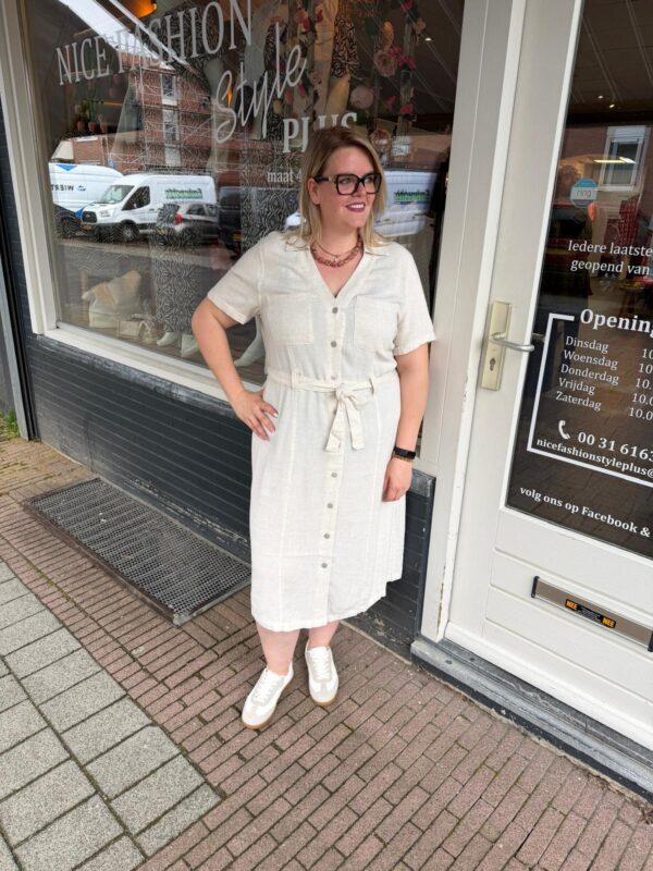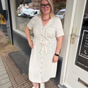 Luchtige jurk met knoopsluiting, kraag en tailleband voor een mooie pasvorm. Comfortabel én stijlvol, perfect voor elke dag!