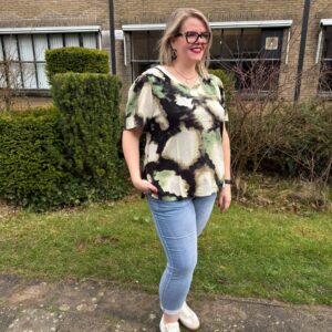 Trendy ONLY Carmakoma top in een groen, zwart en beige print. De luchtige stof en losvallende pasvorm zorgen voor een comfortabele fit, terwijl de V-hals een vrouwelijke touch geeft. Perfect voor elke dag