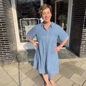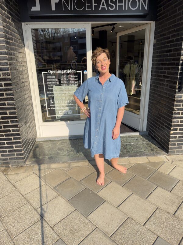 De jurk heeft een doorknoopsluiting en kraag, wat zorgt voor een klassieke denim look met een moderne twist. Dankzij de losvallende pasvorm draagt hij heerlijk en is hij perfect voor elke dag.