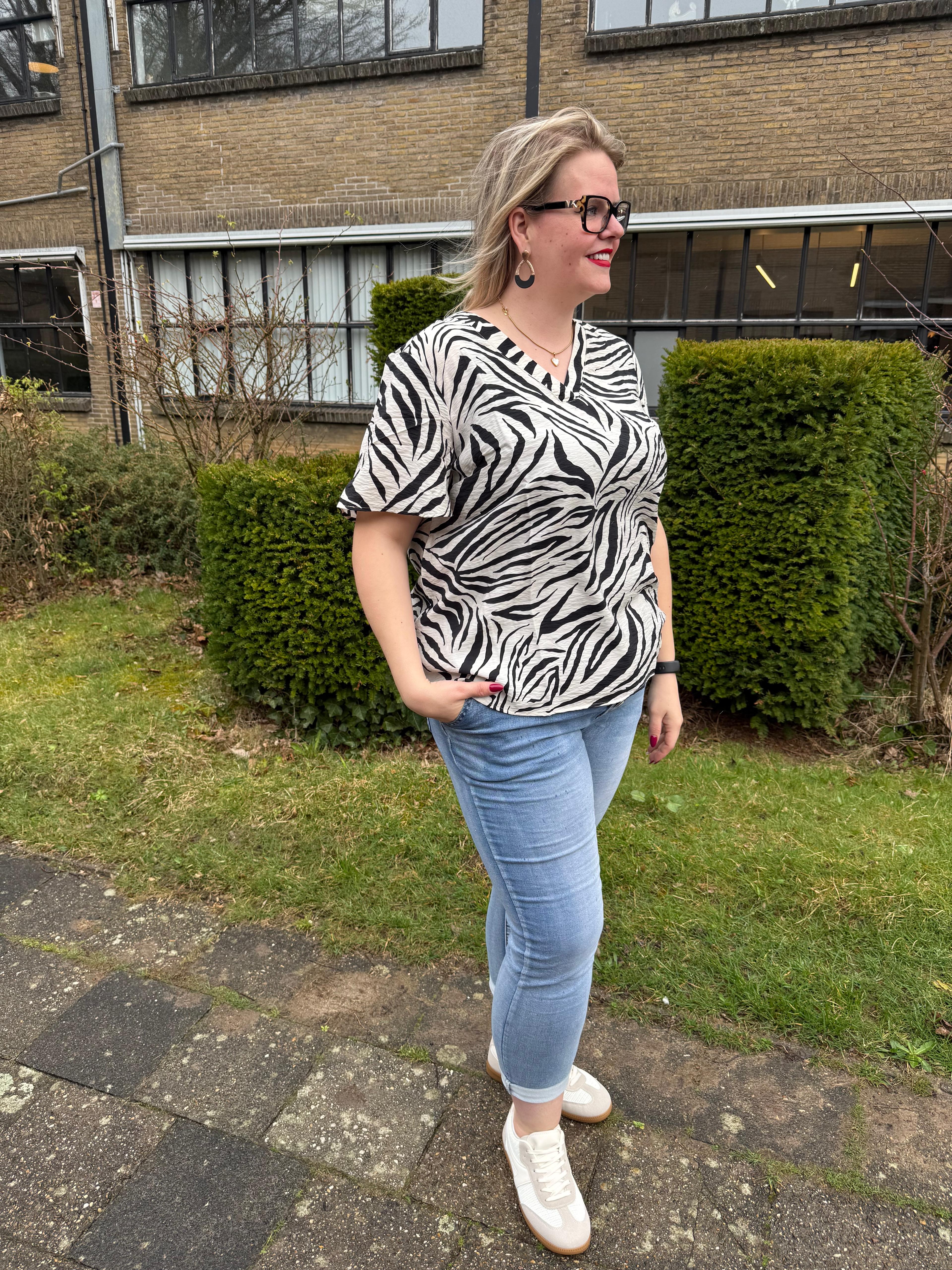 Deze trendy Vero Moda Curve top is een echte eyecatcher dankzij de opvallende zwart-witte zebra print. Perfect voor wie houdt van een speelse en modieuze look.